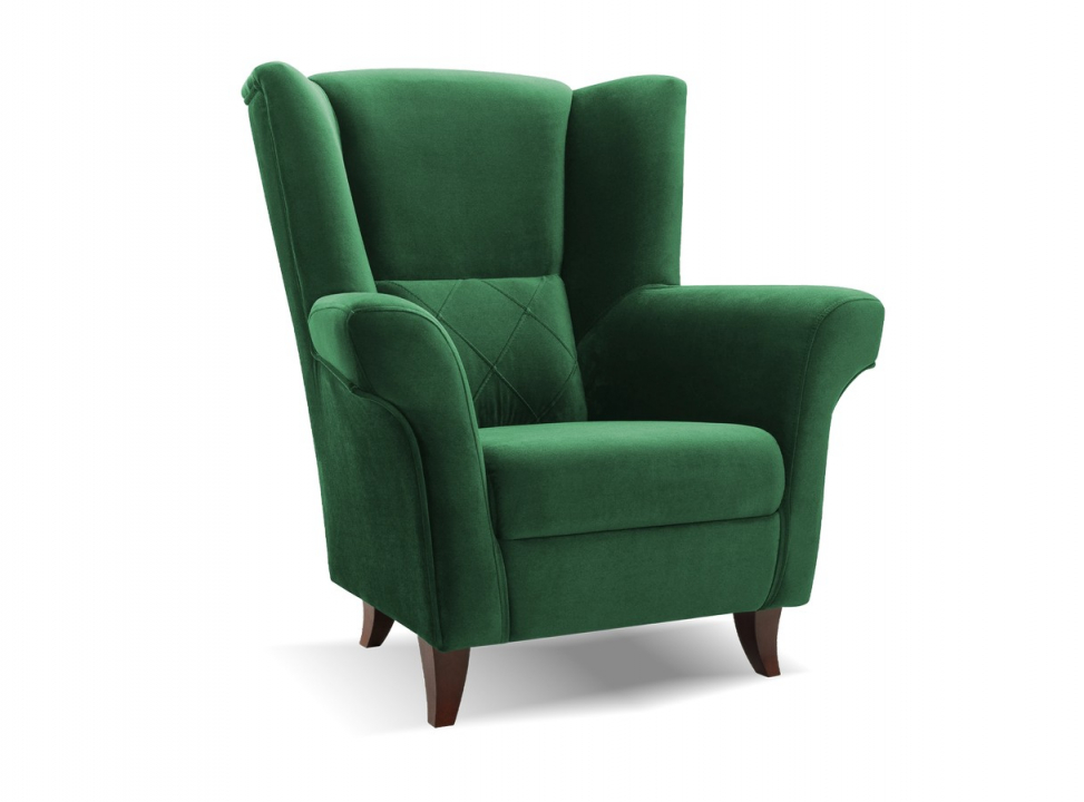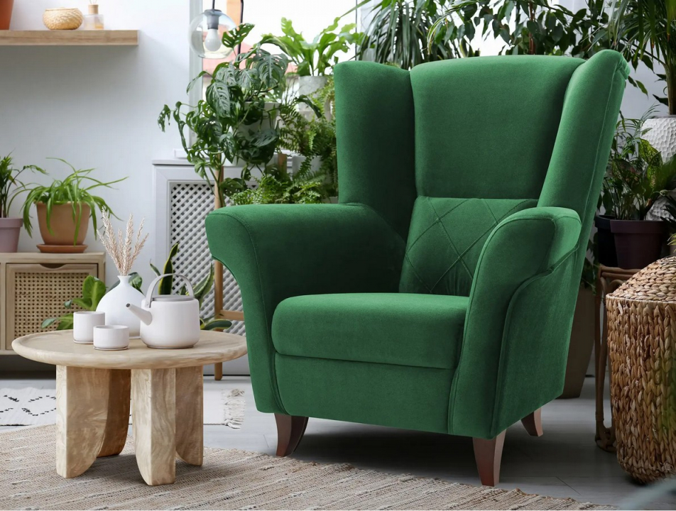 Křeslo ušák Keno od RV-nábytek v elegantním provedení Kronos 19 zelená představuje dokonalé spojení stylu, pohodlí a kvalitního zpracování. Výrazná zelená látka dodává interiéru svěžest a charakter, zatímco dřevěné nohy v odstínu tmavý ořech podtrhují jeho elegantní vzhled.