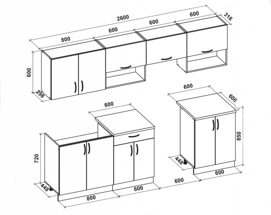 kuchyňská linka rea 200 cm bílá 57 cm + pracovní deska, variabilní sestava