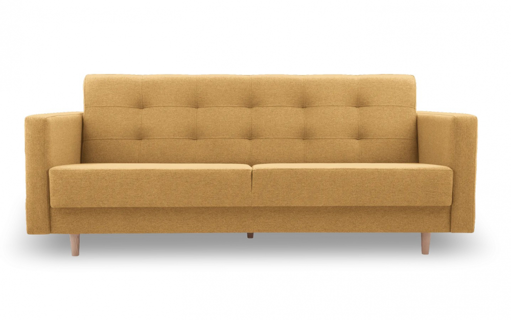 Pohovka Gordon 3R od rv-nábytek, rozkládací s úložným prostorem. Potah Norn 65 žlutá, výplň PUR pěna a pružiny Bonell, výška sedu 45 cm.