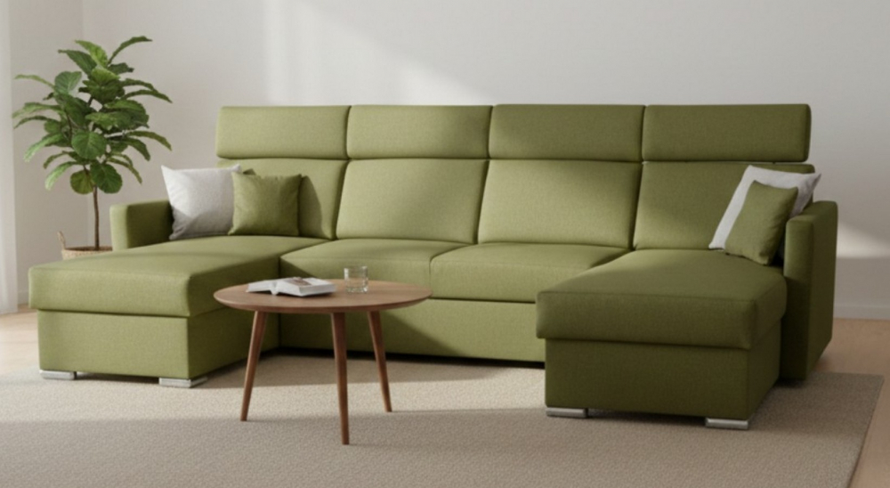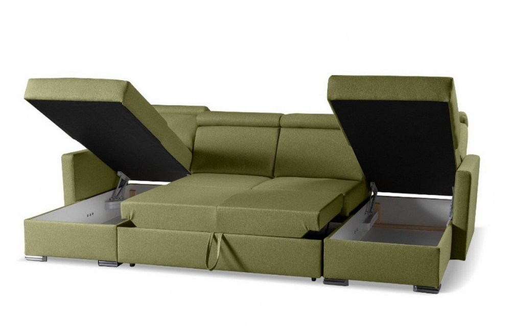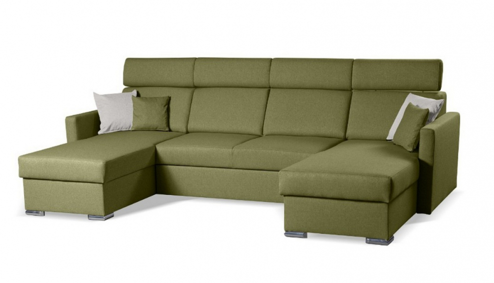 Sedací souprava Santorini U od rv-nábytek, rozkládací sedací souprava s úložným prostorem. Potah Wind 34 olivová, výplň PUR pěna a pružina Falista, výška sedu 43 cm, hloubka sedu 54 cm.