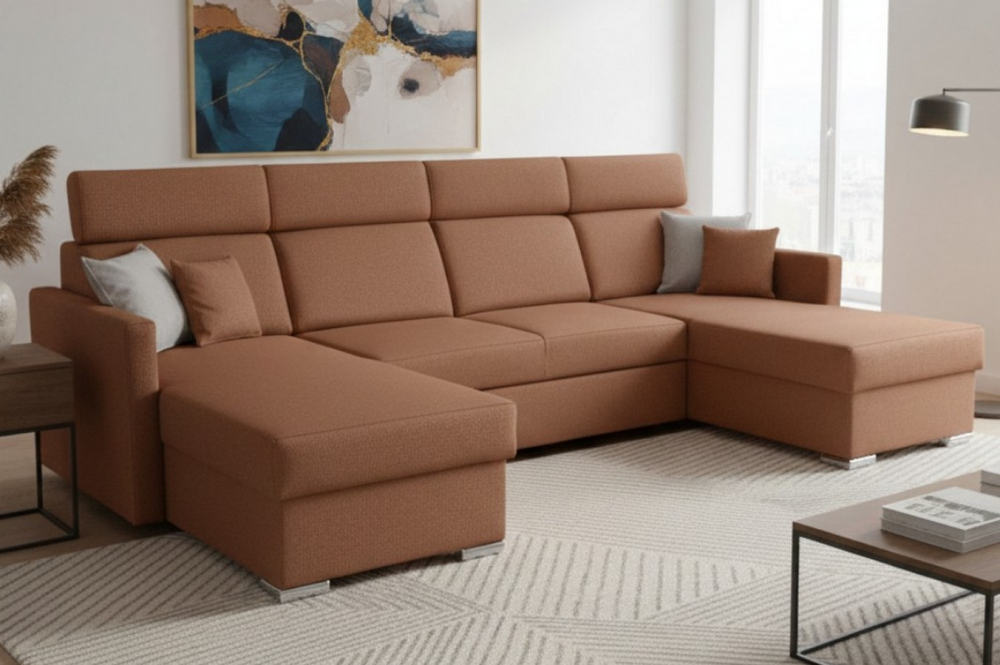 Sedací souprava Santorini U od rv-nábytek, rozkládací sedací souprava s úložným prostorem. Potah Wind 56 terracota, výplň PUR pěna a pružina Falista, výška sedu 43 cm, hloubka sedu 54 cm.