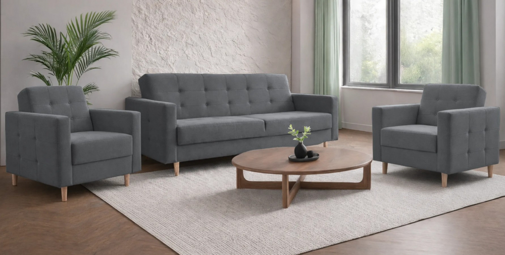 Sedací souprava Gordon 3R + 1 + 1 od rv-nábytek, rozkládací s úložným prostorem. Potah Norn 15 šedá, výplň PUR pěna + pružina Bonell, výška sedu 45 cm.