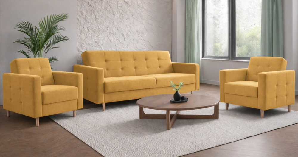 Sedací souprava Gordon 3R + 1 + 1 od rv-nábytek, rozkládací s úložným prostorem. Potah Norn 65 žlutá, výplň PUR pěna + pružina Bonell, výška sedu 45 cm.