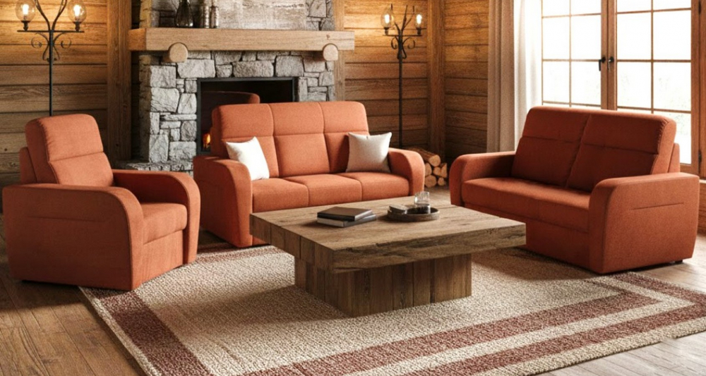 Sedací souprava Henri 3R+2+1 od rv-nábytek, rozkládací. Potah Brooklyn terracota, Výplň PUR pěna + pružina Falista, výška sedu 48 cm, hloubka sedu 52 cm.