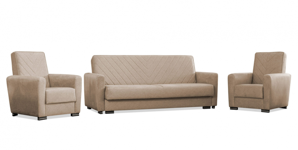 Sedací souprava je rozkládací s úložným prostorem a skládá se z trojsedáku a dvousedáku a křesla.
