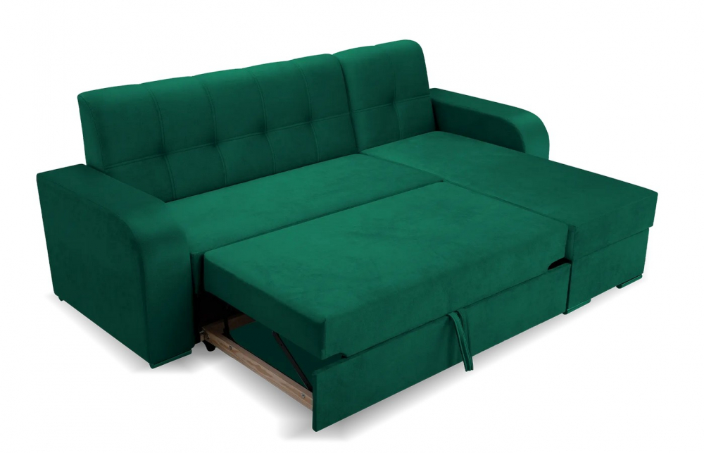 Sedací souprava Id-Orco od rv-nábytek, rozkládací sedací souprava s úložným prostorem. Potah Monolith 37 zelená, výplň PUR pěna a pružina Bonell a Falista, výška sedu 45 cm, hloubka sedu 60 cm.
