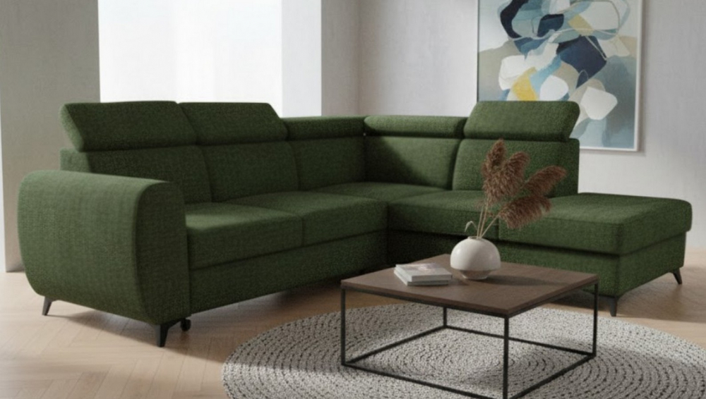 Sedací souprava Wengen od rv-nábytek, rozkládací sedací souprava s úložným prostorem. Potah Aragon 39 olivová, výplň PUR pěna a pružina Falista, výška sedu 46 cm, hloubka sedu 65 cm.