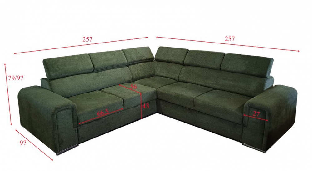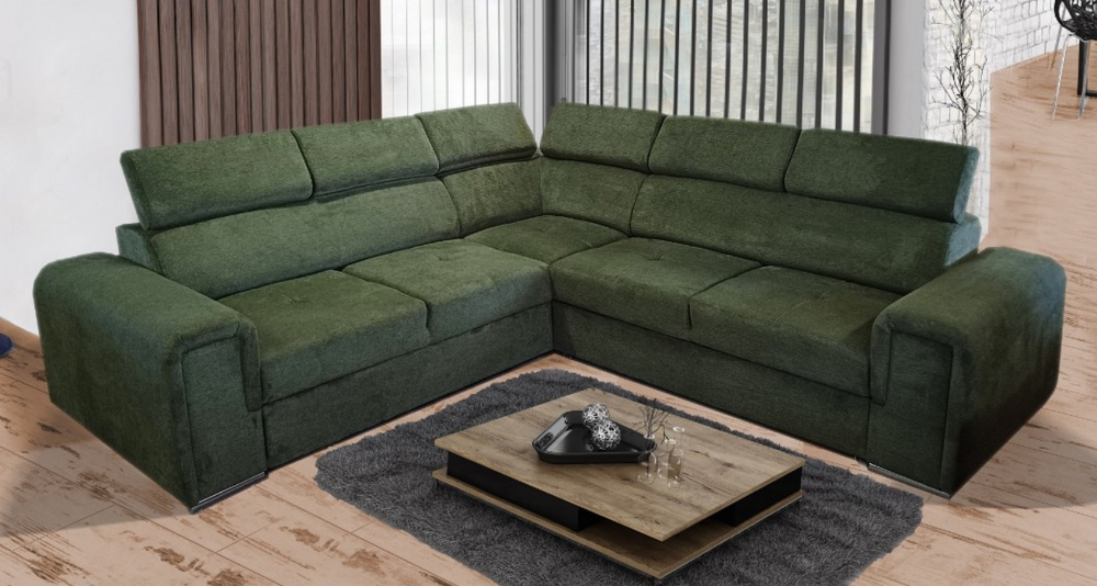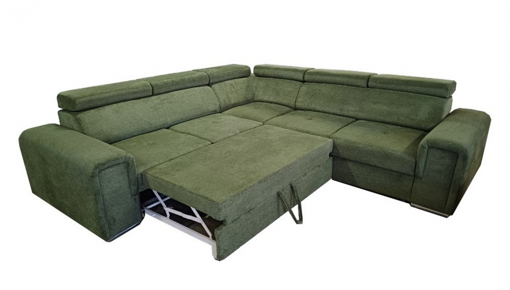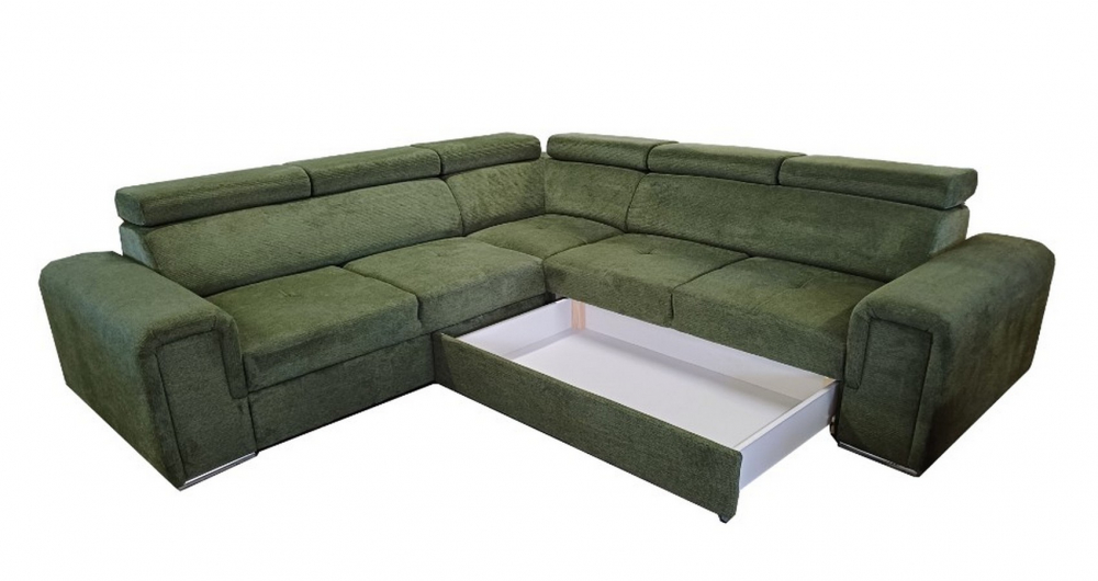 Sedací souprava Madera 1 od rv-nábytek, rozkládací sedací souprava s úložným prostorem. Potah Aragon 39 zelená, výplň PUR pěna a pružina Falista, výška sedu 43 cm, hloubka sedu 56 cm.
