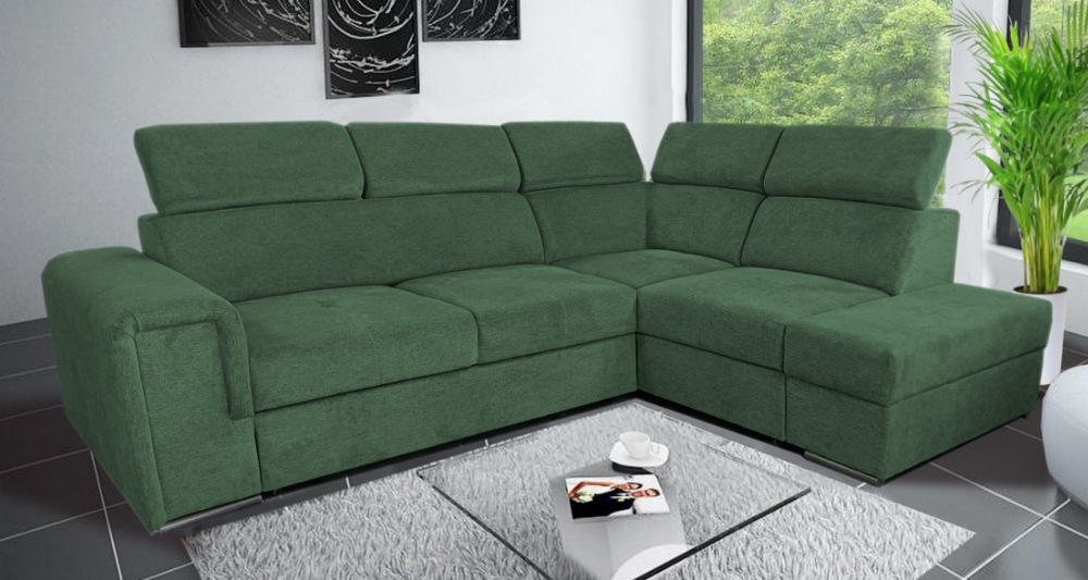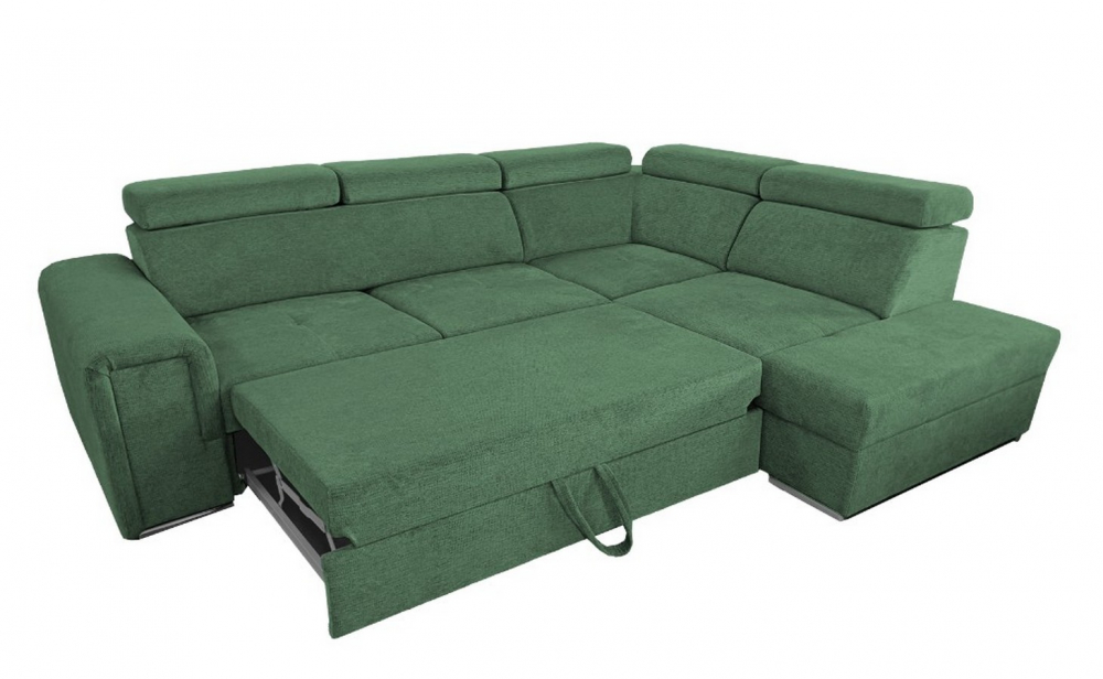 Sedací souprava Madera 2 od rv-nábytek, rozkládací sedací souprava s úložným prostorem. Potah Aragon 39 zelená, výplň PUR pěna a pružina Falista, výška sedu 43 cm, hloubka sedu 56 cm.