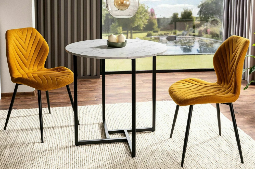 Stolová deska je vyrobena z kvalitního laminovaného materiálu v dekoru bílá efekt mramor, který působí přirozeně a zároveň je praktický pro každodenní používání. Kovové nohy v černém matu zajišťují vysokou stabilitu, pevnost a podtrhují moderní charakter stolu.
