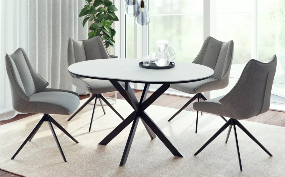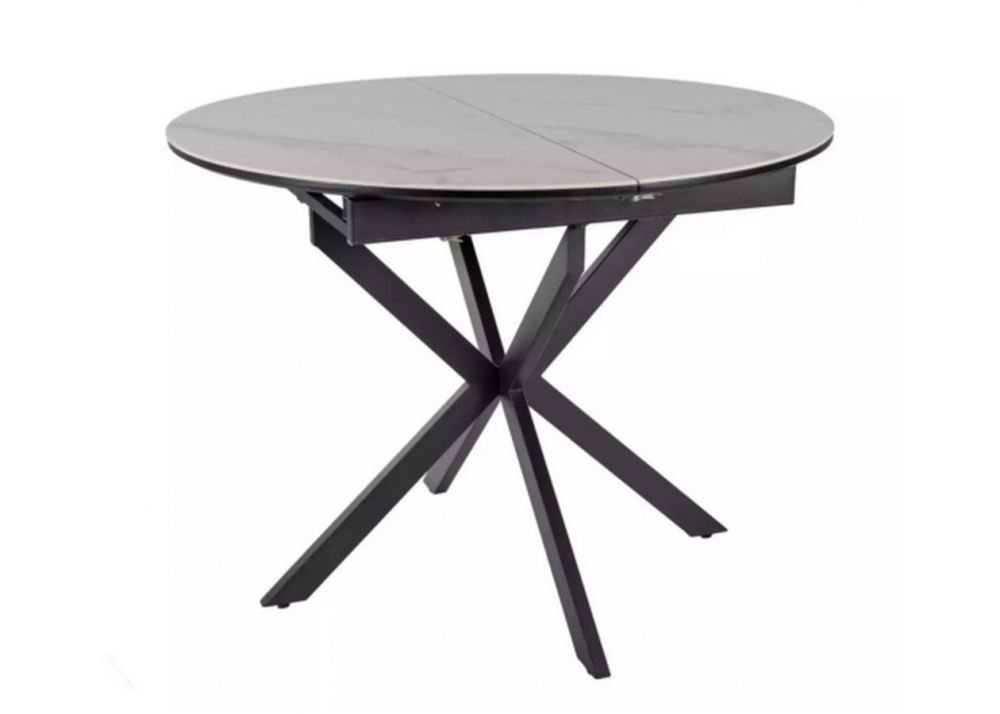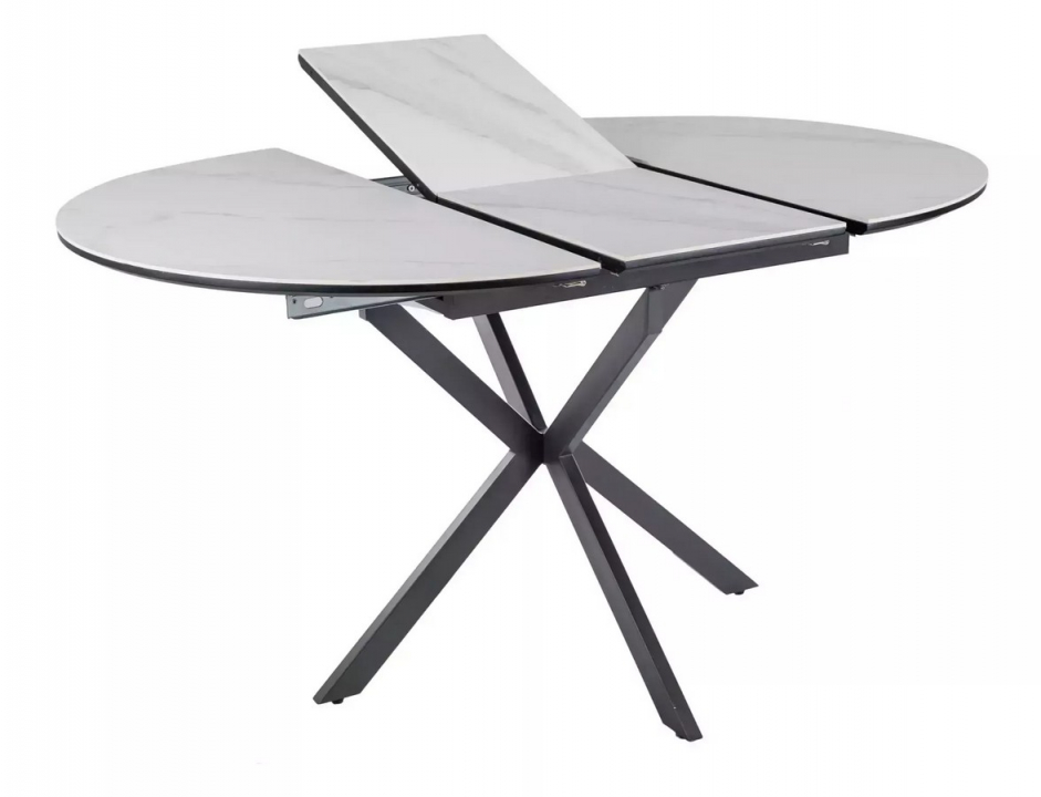 Deska stolu je vyrobena z kvalitní keramické desky v dekoru bílý mramor, které věrně imituje kámen a zároveň je odolná, snadno udržovatelná a vhodné pro každodenní používání. Stabilní noha v kombinaci kov černá dodává stolu moderní vzhled, pevnost a vysokou stabilitu.