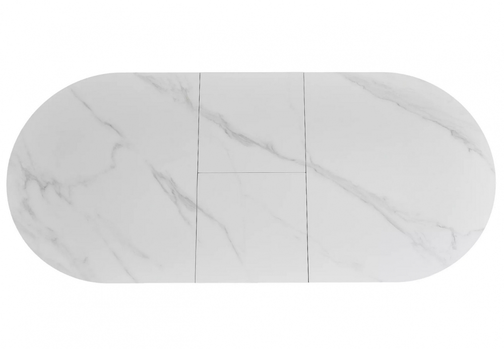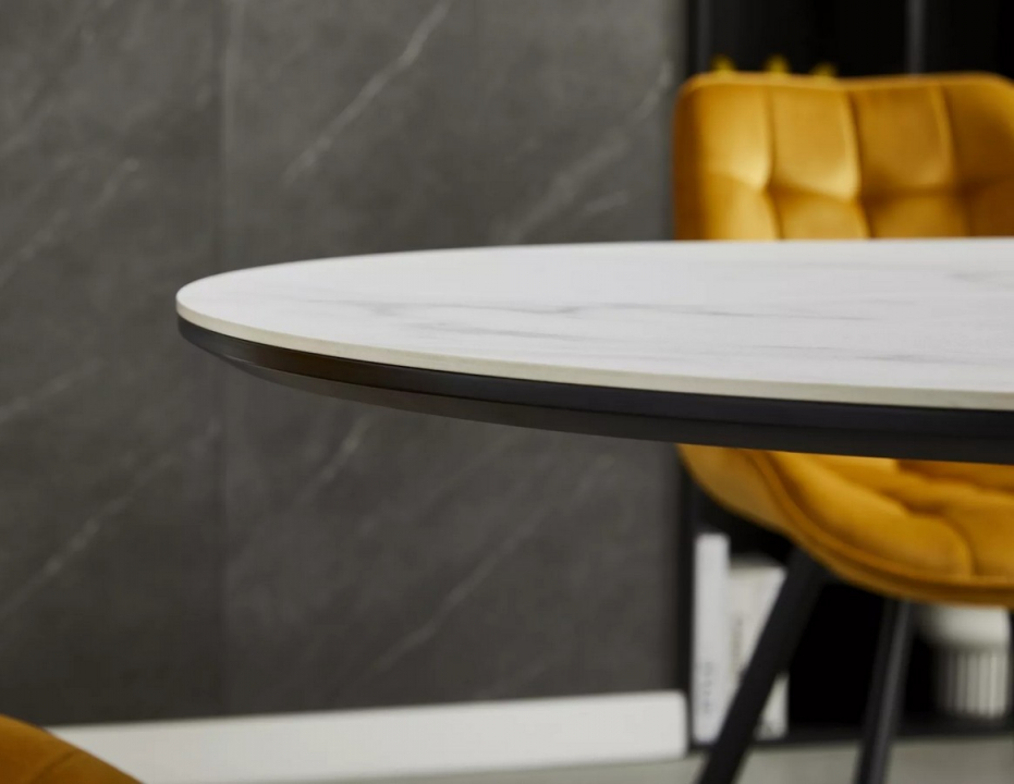 Deska stolu je vyrobena z kvalitní keramické desky v dekoru bílý mramor, které věrně imituje kámen a zároveň je odolná, snadno udržovatelná a vhodné pro každodenní používání. Stabilní noha v kombinaci kov černá dodává stolu moderní vzhled, pevnost a vysokou stabilitu.