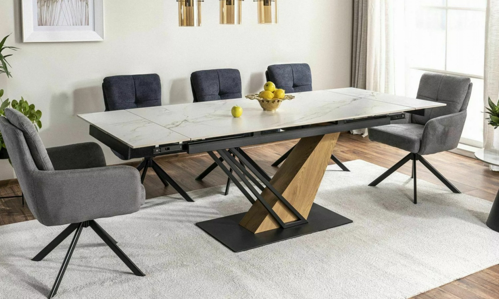 Jídelní stůl Genesis rozkládací je perfektní volbou pro ty, kteří hledají moderní rozkládací jídelní stůl v dekoru bílá mramor, který spojuje styl, praktičnost a dostatek místa pro pohodlné stolování.