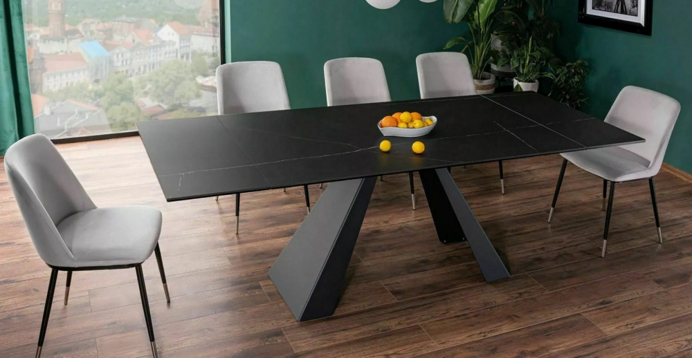 Jídelní stůl Salvadore 160 cm Sahara Noir rozkládací je perfektní volbou pro ty, kteří hledají moderní luxusní rozkládací jídelní stůl s keramickou deskou v dekoru černý mramor, který spojuje eleganci, odolnost a maximální komfort při stolování.