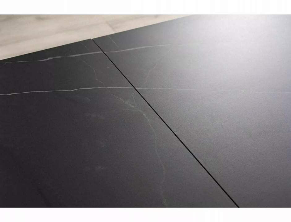 Deska stolu je vyrobena z kvalitní keramiky v dekoru Sahara Noir černý mramor, která působí luxusně, elegantně a zároveň je mimořádně praktická pro každodenní používání. Keramický povrch je odolný, snadno udržovatelný a vhodný pro moderní domácnosti. Stabilní nohy v černém matném provedení podtrhují moderní charakter stolu a zajišťují pevnost i vysokou stabilitu.