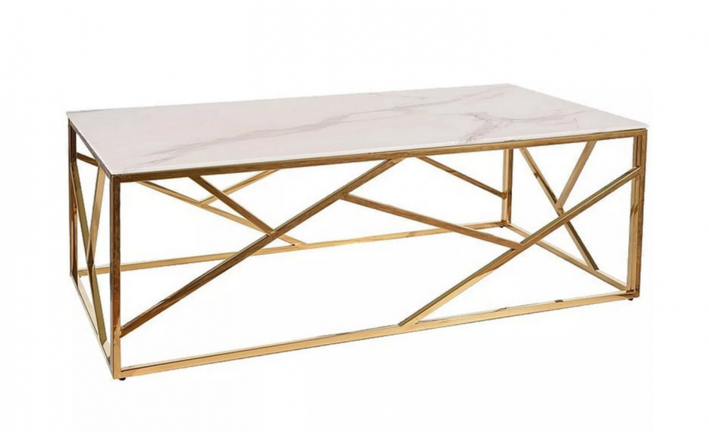 Konferenční stůl Escada A2 s deskou z tvrzeného skla v dekoru bílý mramor a kovovými nohami ve zlatém provedení. Elegantní a luxusní stolek vhodný do obývacího pokoje i moderního glamour interiéru.