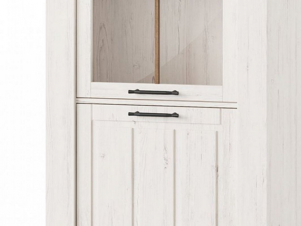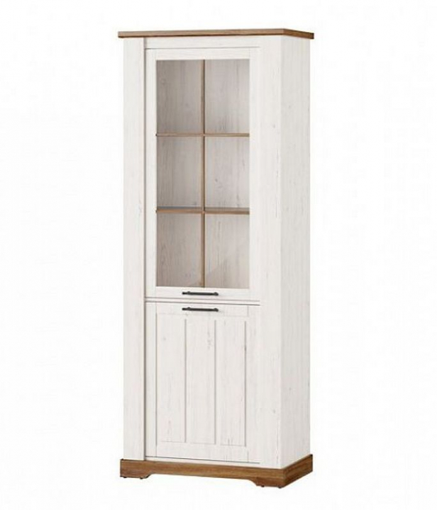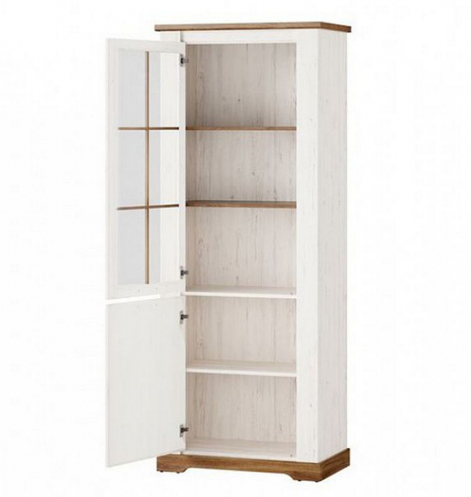 Vitrína má barevné provedení dub stirling v kombinaci s bílou borovicí andersen. Součástí jsou 4 police (max. nosnost jedné police je 5 kg).
